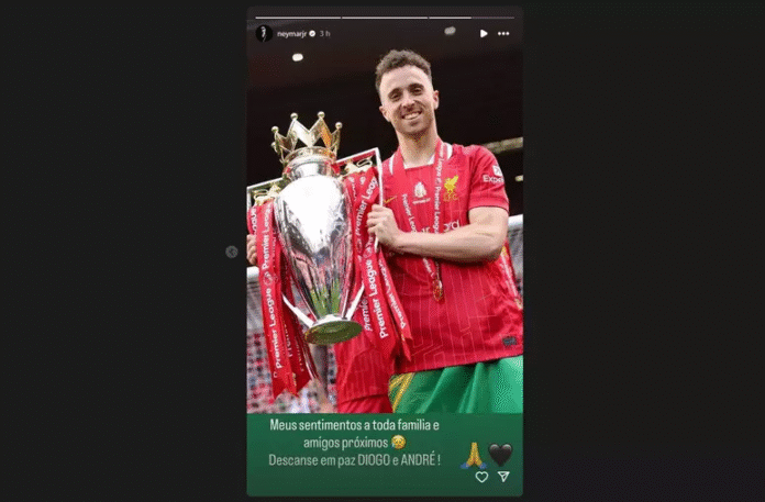 Neymar Jr., atualmente no Santos, utilizou as redes sociais nesta quinta-feira (03) para prestar solidariedade pela morte de Diogo Jota e seu irmão André Silva. O atacante publicou uma mensagem nos stories de seu perfil oficial com a imagem do jogador do Liverpool segurando o troféu da Premier League e escreveu: