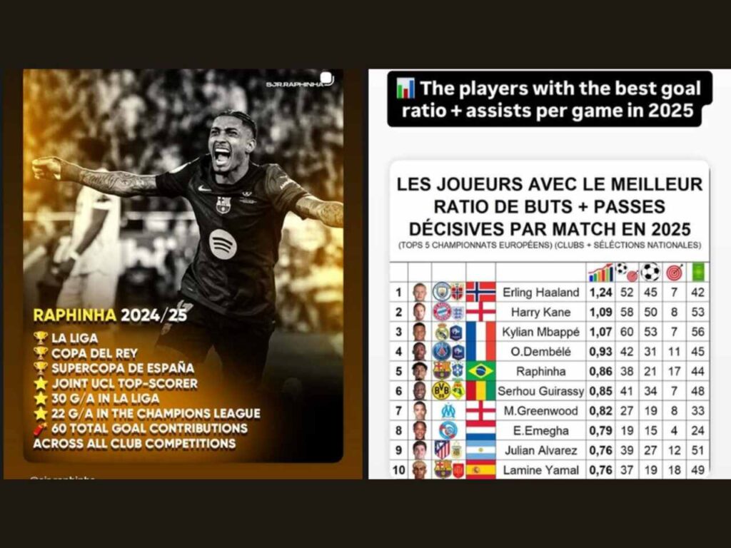 De acordo com os dados compartilhados pelo próprio atleta, Raphinha participou diretamente de 62 gols em 64 partidas, somando finalizações e assistências — uma das melhores marcas entre jogadores das grandes ligas europeias.
