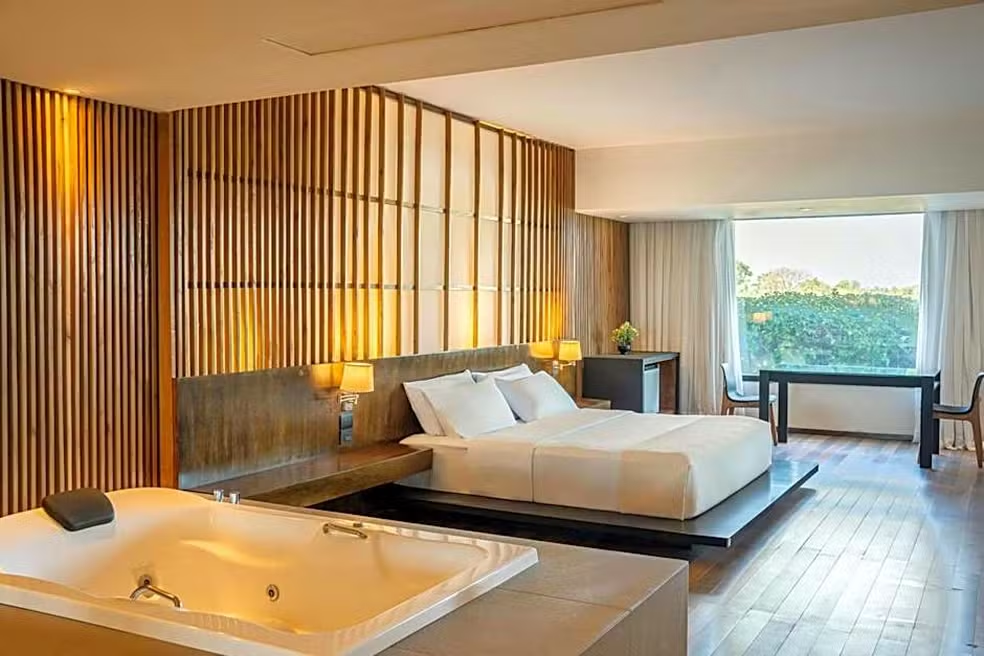 A estrutura do resort inclui praia privativa de 200 metros, campo de golfe, piscina ao ar livre e suítes com hidromassagem. As diárias variam entre R$ 897 e R$ 1.269, conforme o site oficial. A hospedagem fica a 13 km do estádio onde será disputada a final e a 17 km do aeroporto internacional da capital.