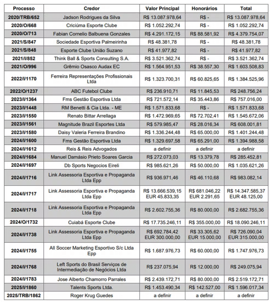 O prazo de vencimento dessa parcela havia expirado na última sexta-feira (17). Com o atraso, o Cuiabá, um dos maiores credores do clube paulista, solicitou à CNRD a imposição da sanção que impede o registro de novos atletas. A notificação foi oficialmente registrada na manhã desta segunda.